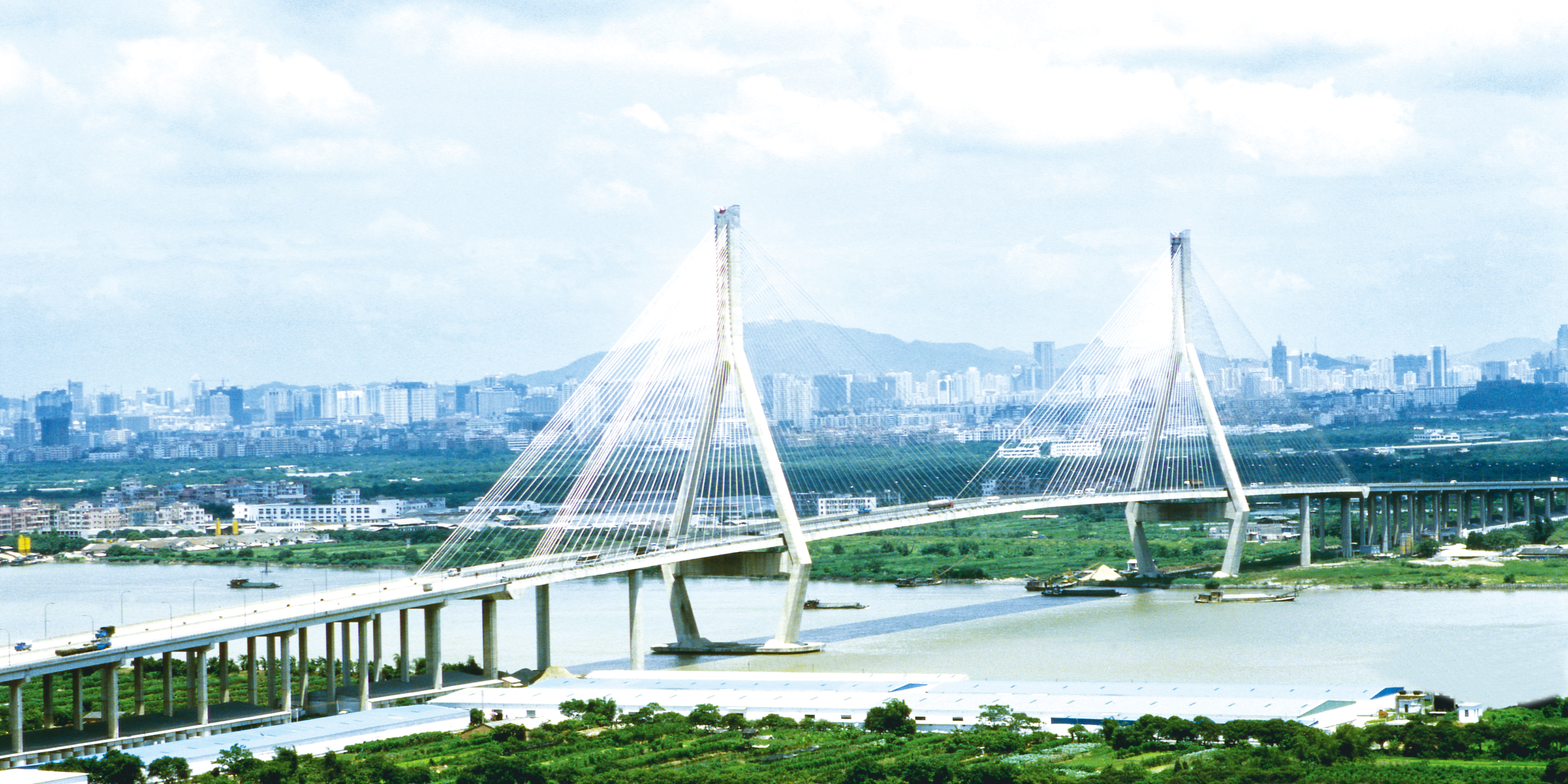 1998年建成通車,全長3458.2米。三跨連續(xù)雙塔空間雙索面漂浮體系超寬斜拉橋。該橋橋型新穎、造型美觀,是當(dāng)時世界上車道數(shù)最多、最寬的砼斜拉橋,創(chuàng)造了六項世界紀(jì)錄及兩項國內(nèi)紀(jì)錄。榮獲國家質(zhì)量銀質(zhì)獎、交通部優(yōu)秀公路工程設(shè)計二等獎、廣東省優(yōu)秀設(shè)計一等獎、廣東省優(yōu)秀勘察三等獎。