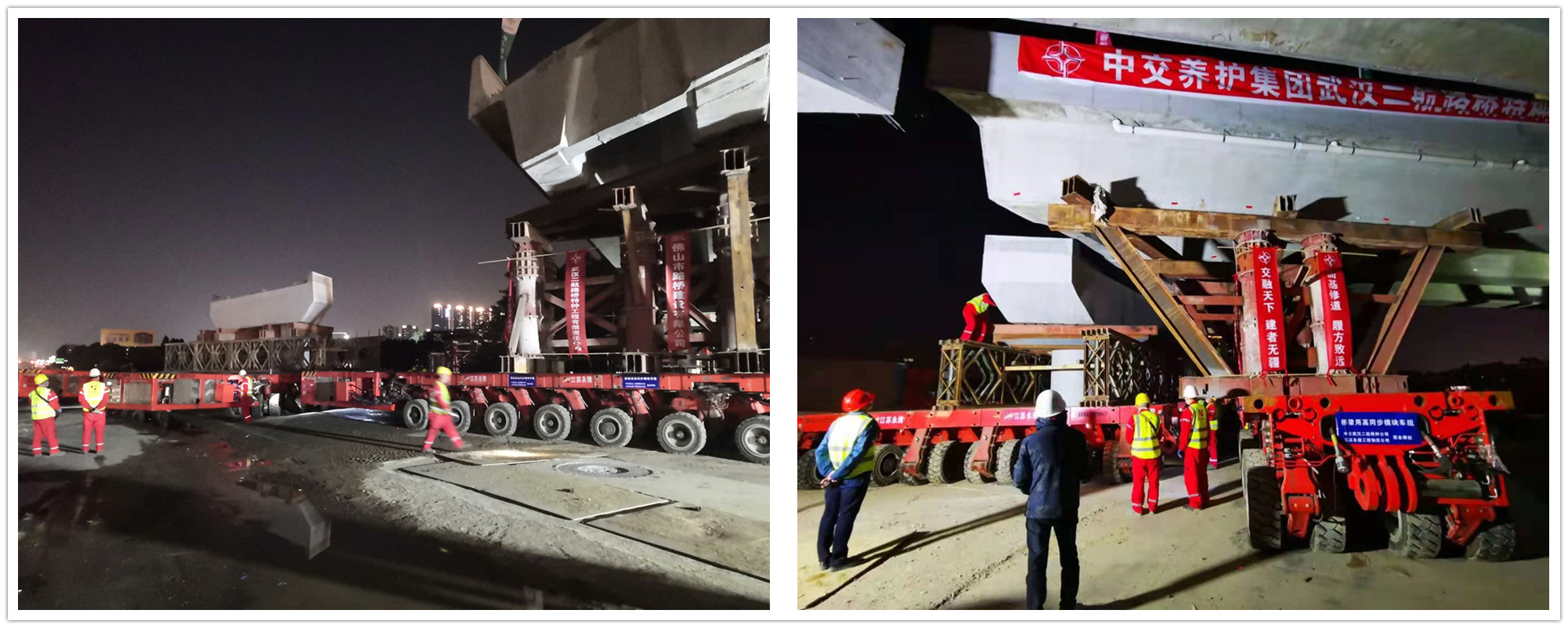 為確保項目按時建成通車,我公司想方設法研究新思路、新工藝、新方法,并提出了基于SPMT模塊車快速拆建整跨混凝土上部結(jié)構(gòu)的新工藝。SPMT模塊拆建技術(shù)曾在開陽高速天橋拆建中應用,但整跨移運新建上部為鋼-砼組合梁。與開陽高速改擴建不同的是,本項目上部結(jié)構(gòu)均采用經(jīng)濟性更好的預制PC小箱梁。由于預制PC小箱梁在復雜環(huán)境下的整體運輸、設置大懸臂支撐點困難,對場地要求高,施工安全控制難度大,因此,此前我國僅嘗試了單片小箱梁快速安裝,尚無整跨混凝土小箱梁的安裝案例。整跨或整座混凝土橋的同步安裝,需要整合優(yōu)化結(jié)構(gòu)、工藝、裝備、材料與控制系統(tǒng)等方面的技術(shù)和裝備。