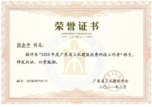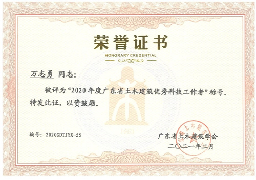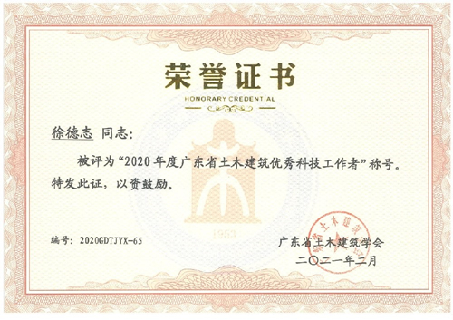 近日,公司被廣東省土木建筑學(xué)會授予“2020年度廣東省土木建筑科技創(chuàng)新先進(jìn)企業(yè)”榮譽稱號;公司副總工程師梁志勇和萬志勇、巖土勘察院院長張金平、第四設(shè)計院總工程師徐德志4人被評為“2020年度廣東省土木建筑優(yōu)秀科技工作者”。特此報喜。