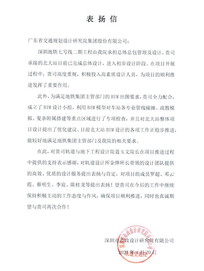 近日,項目總體單位深圳市市政設計研究院有限公司發(fā)來表揚信,對我公司在深圳地鐵七號線二期工程北大站項目的總體設計、初步設計以及BIM設計等各項工作中所展現(xiàn)的高質(zhì)量專業(yè)技術水平和高素質(zhì)設計服務水平給予了充分肯定,并點名表揚了具體負責該項目的團隊組成員。
