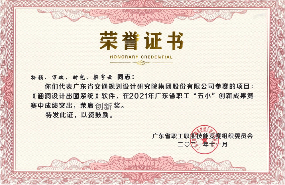 11月23—24日,2021年廣東省職工“五小”創(chuàng)新成果競賽決賽暨總結(jié)大會在廣州舉行。本次競賽由廣東省總工會、廣東省人力資源和社會保障廳、廣東省工業(yè)和信息化廳、廣東省科學(xué)技術(shù)廳主辦,廣東省總工會職工技術(shù)協(xié)作中心、廣東省質(zhì)量協(xié)會、廣州市質(zhì)量協(xié)會承辦。經(jīng)過激烈的角逐,公司數(shù)字化技術(shù)研究院研發(fā)的《涵洞設(shè)計(jì)出圖系統(tǒng)》軟件榮獲創(chuàng)新獎。