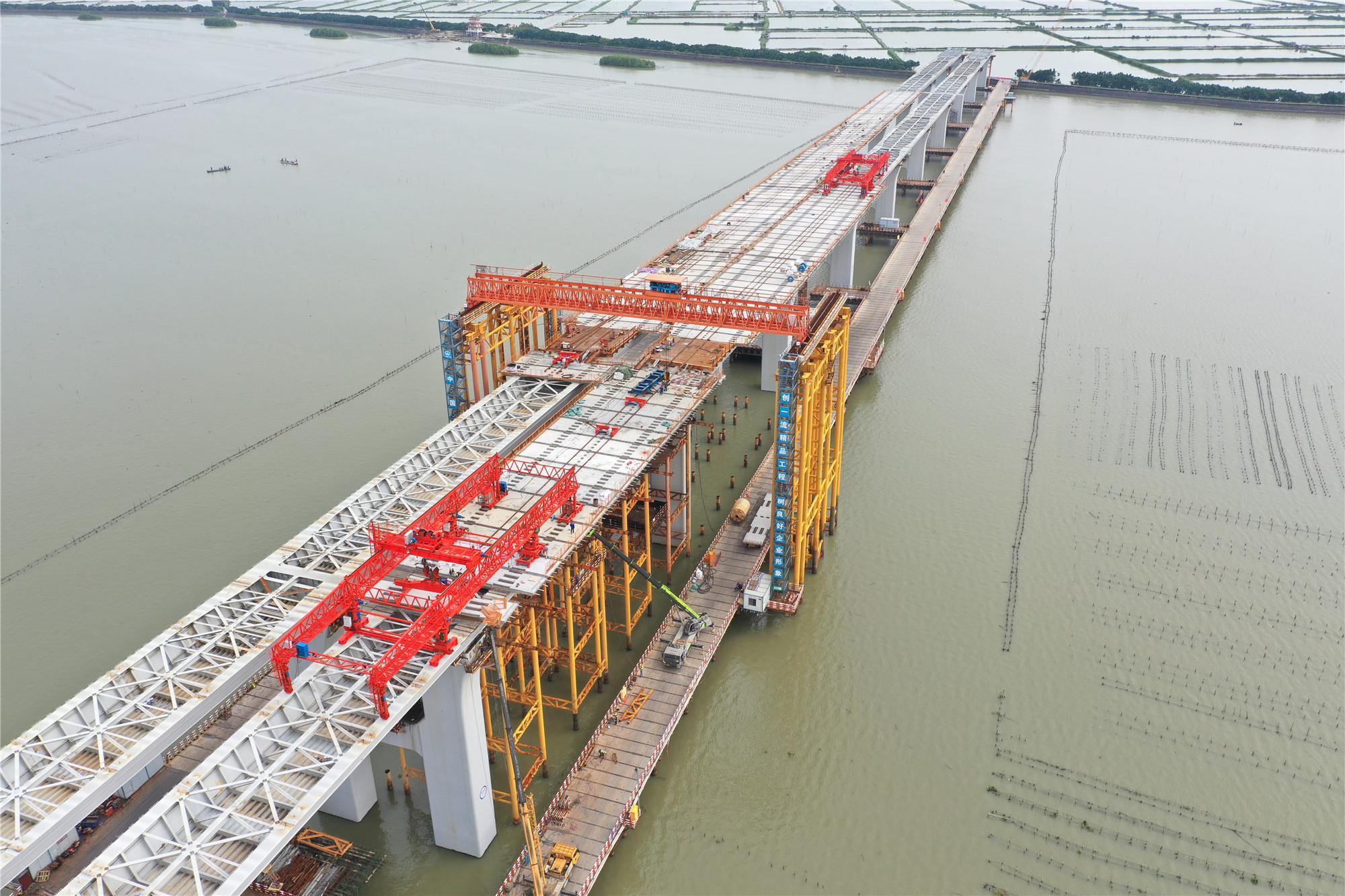 汕頭市牛田洋快速通道工程起點(diǎn)位于汕頭市城區(qū)西側(cè),路線長15.8km,主線橋梁總長14.2km。項目設(shè)計施工難度大,涉及抗風(fēng)、抗震、防腐、防撞、公軌合建等復(fù)雜因素。牛田洋大橋采用主跨 468m半漂浮體系雙塔雙索面鋼桁梁斜拉橋,上層公路、下層軌道斷面布置方式;軌道交通采用跨座式單軌制式。水中引橋為70~80m分層布置鋼混組合梁,采用上、下層同步頂推施工方案;陸上引橋為30~75m鋼混組合梁,采用雙槽型無中橫梁體系。鋼混組合梁為廣東省首次大規(guī)模采用。