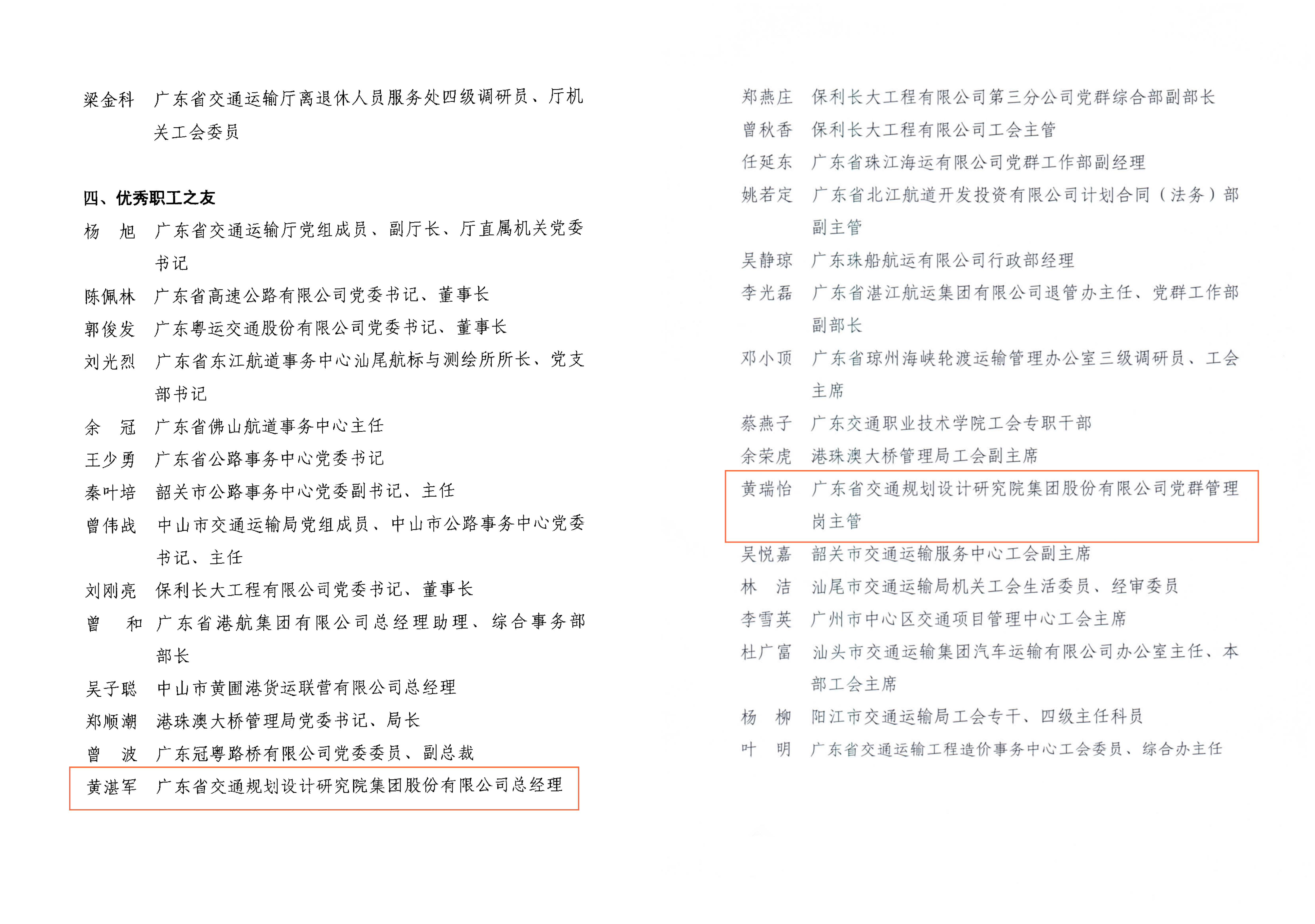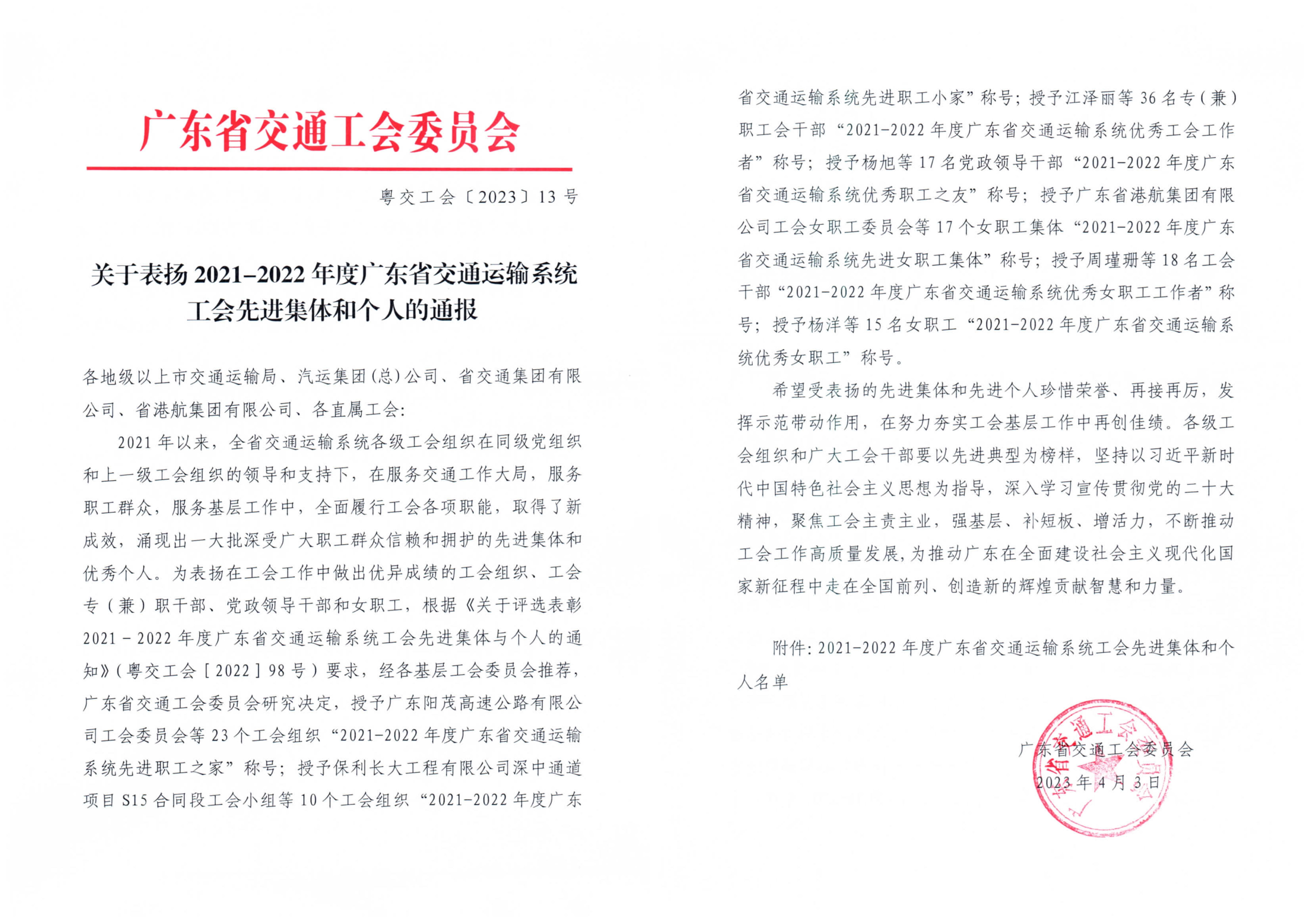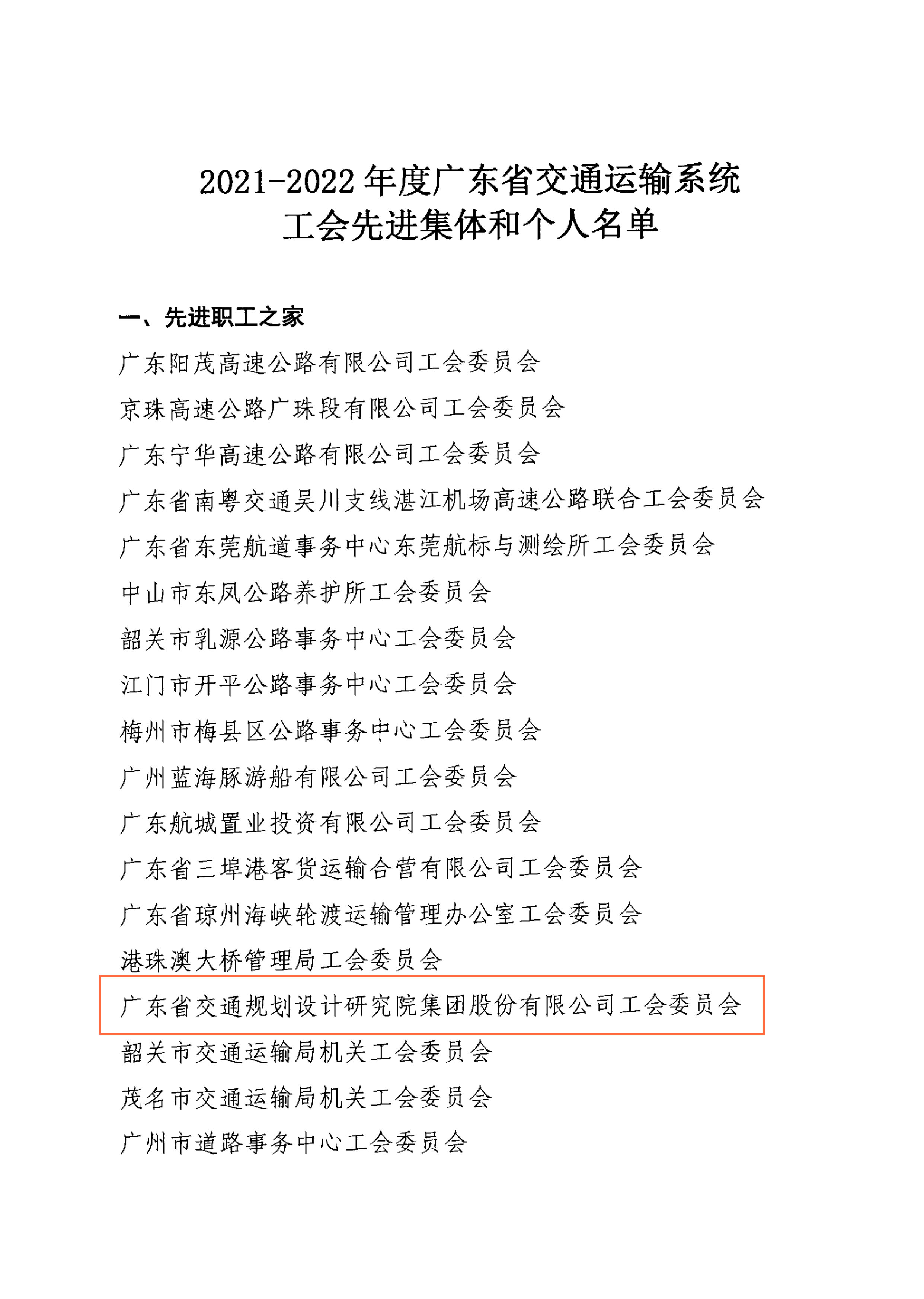 近日,集團工會被廣東省交通工會委員會授予2021-2022年度廣東省交通運輸系統(tǒng)“先進職工之家”榮譽稱號;集團總經理黃湛軍獲評為“優(yōu)秀職工之友”,綜合管理辦公室黃瑞怡獲評為“優(yōu)秀工會工作者”。特此報喜!