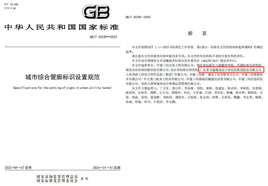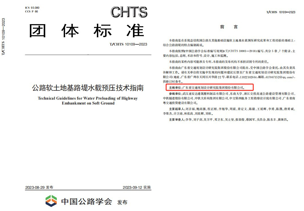 近日,公司參編的國家標(biāo)準(zhǔn)《城市綜合管廊標(biāo)識(shí)設(shè)置規(guī)范》(GB/T 43239—2023)以及主編的中國公路學(xué)會(huì)團(tuán)體標(biāo)準(zhǔn)《公路軟土地基路堤水載預(yù)壓技術(shù)指南》(T/CHTS10109—2023)兩項(xiàng)標(biāo)準(zhǔn)成果正式發(fā)布。