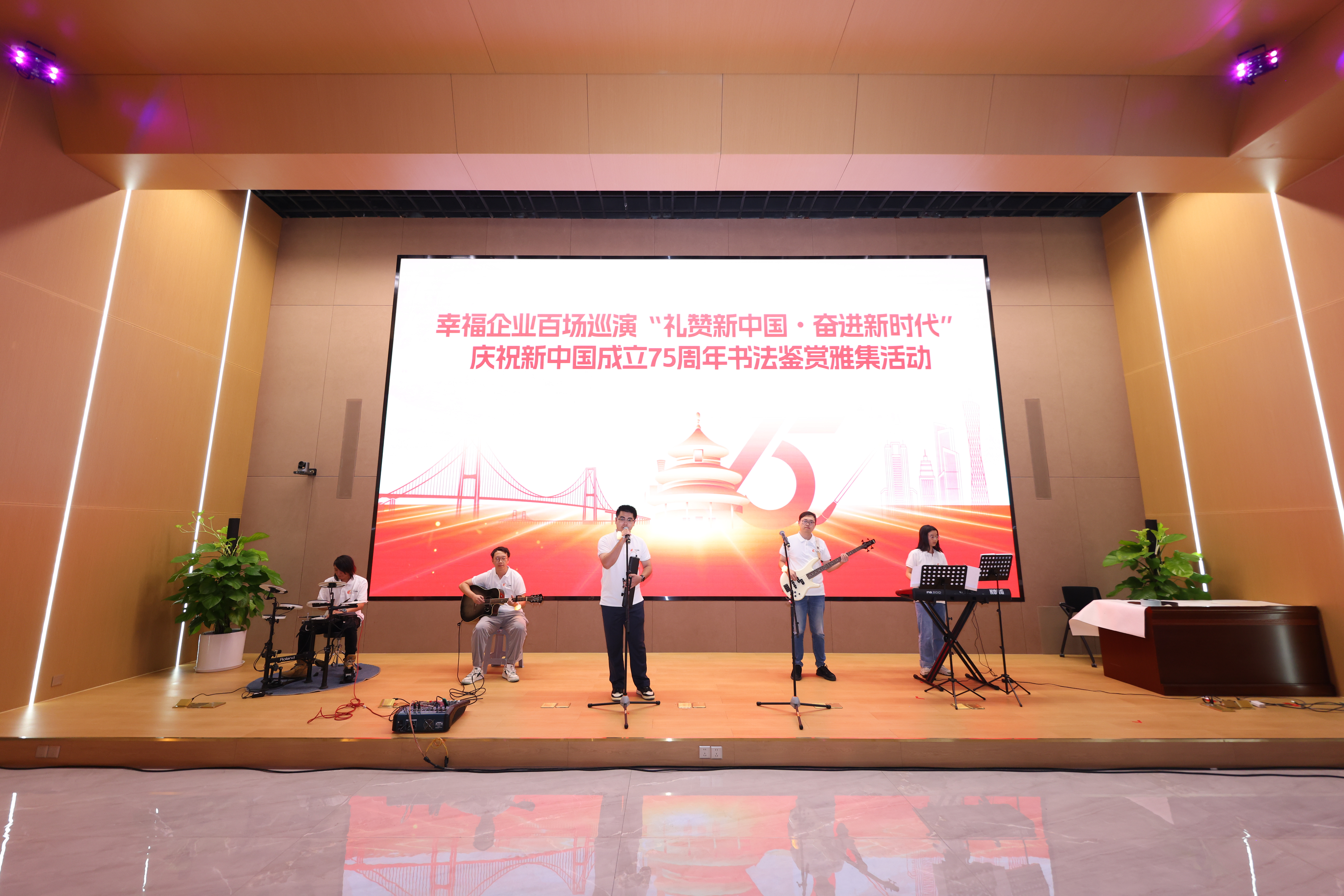 翰墨丹青頌經(jīng)典,以文會(huì)友譜華章。廣州美術(shù)學(xué)院譚文選老師以其深厚的藝術(shù)造詣和生動(dòng)的講解方式,為現(xiàn)場(chǎng)觀眾帶來了一場(chǎng)別開生面的書法鑒賞授課,使大家從中領(lǐng)略了書法藝術(shù)的獨(dú)特魅力?;顒?dòng)中還穿插了書法獻(xiàn)禮環(huán)節(jié),譚老師現(xiàn)場(chǎng)揮毫潑墨,創(chuàng)作了一幅寓意深遠(yuǎn)的書法作品,在祖國母親75歲生日之際,向祖國獻(xiàn)上最真摯的祝福,祝福祖國繁榮昌盛,祝福人民幸福安康。