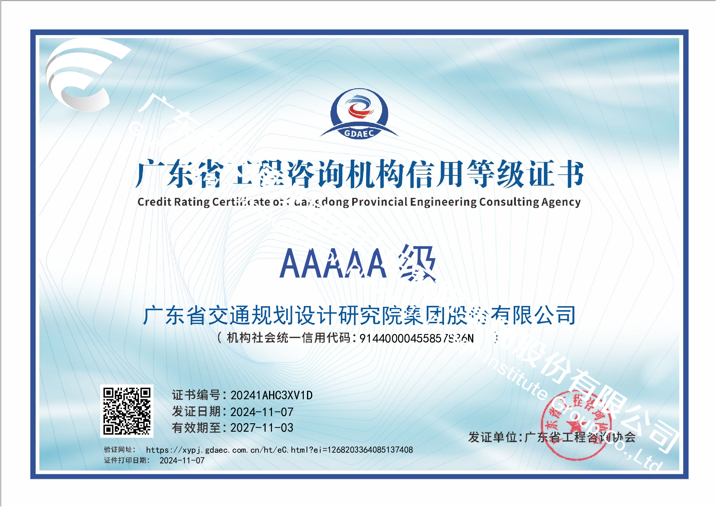 近日,廣東省工程咨詢協(xié)會正式發(fā)布《2024年度廣東省工程咨詢機構信用評價等級結果》(為首次評定),公司獲評為“廣東省信用評價AAAAA(5A)級工程咨詢機構”,5A為評定最高級別。