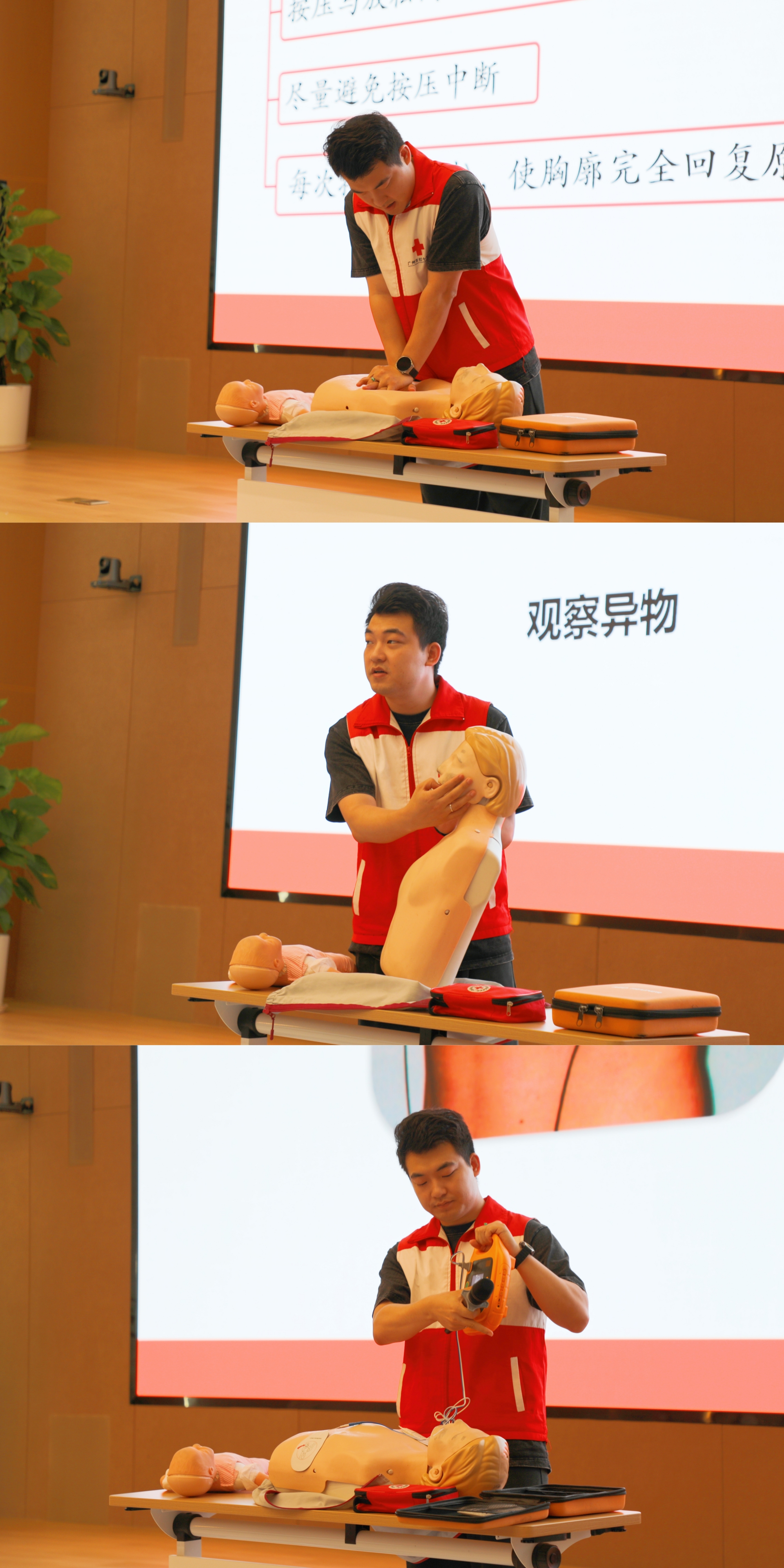 培訓現(xiàn)場,市紅十字會應急救護講師結(jié)合救護案例,指出了常見的急救誤區(qū),提供了正確的急救觀念及講解了心肺復蘇術(shù)、AED的操作使用、氣道異物梗阻的處理、外出血的止血與包扎等應急救護知識,同時,模擬演示了各項應急救護的操作細節(jié)。