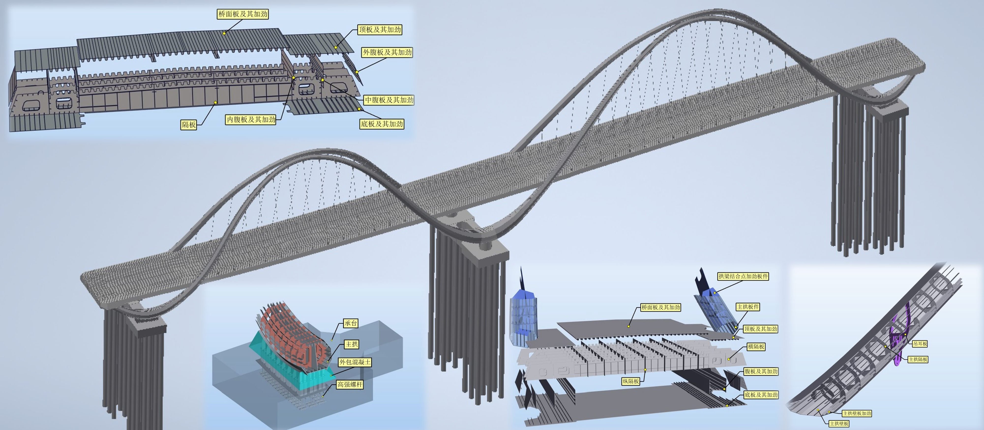 本項目依托金津特大橋進(jìn)行了復(fù)雜空間異形拱橋BIM正向設(shè)計技術(shù)研究。結(jié)合不同設(shè)計階段的需求,聚焦于參數(shù)化、數(shù)字化、可視化三大維度,開創(chuàng)性地提出了復(fù)雜空間異形拱橋BIM正向設(shè)計技術(shù)路線,以全面的數(shù)字化手段賦能項目高效協(xié)作;結(jié)合自主研發(fā)的鋼箱梁設(shè)計出圖一體化工具,高效完成了金津特大橋二維圖紙和三維模型的自動化生產(chǎn),大幅提升了設(shè)計質(zhì)量和效率,探索了一條適用于復(fù)雜空間異形拱橋的正向設(shè)計技術(shù)路徑。