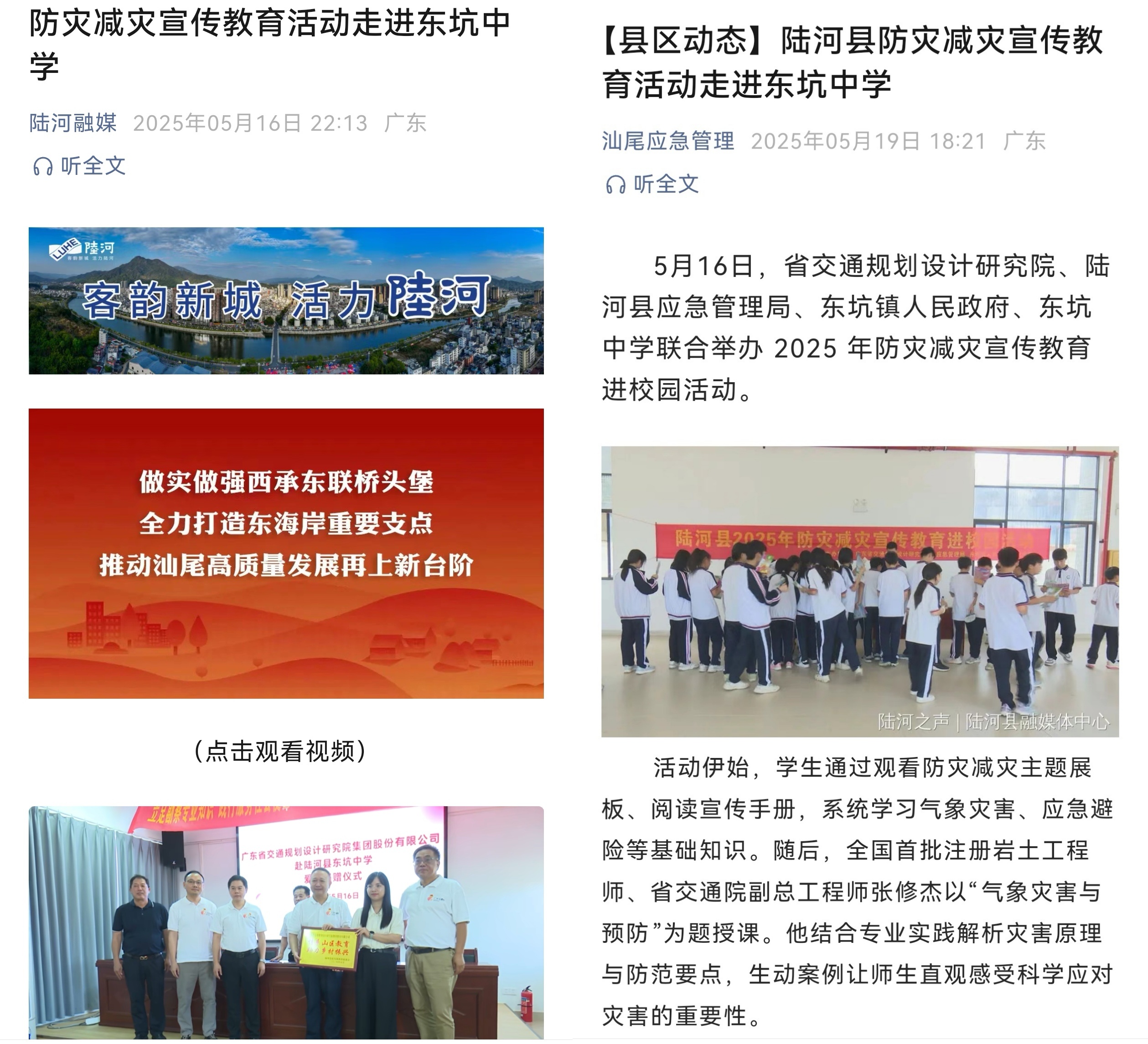 2025年5月12日是第17個(gè)全國防災(zāi)減災(zāi)日,今年的主題是“人人講安全、個(gè)個(gè)會(huì)應(yīng)急——排查身邊災(zāi)害隱患”,5月12日至18日為防災(zāi)減災(zāi)宣傳周。為深入貫徹落實(shí)習(xí)近平總書記關(guān)于防災(zāi)減災(zāi)救災(zāi)重要論述精神及黨中央、國務(wù)院決策部署,切實(shí)推動(dòng)防災(zāi)減災(zāi)科普宣教工作走深走實(shí),5月16日下午,由公司黨委委員、紀(jì)委書記、副總經(jīng)理田可耕和工程勘察院組成的第八黨支部聯(lián)合由公司總工程師孫向東、總工程師辦公室、科技質(zhì)量部、財(cái)務(wù)管理部、董事會(huì)辦公室、綜合管理辦公室組成的第十二黨支部開展支部共建活動(dòng),赴陸河縣東坑中學(xué)開展防災(zāi)減災(zāi)主題科普宣傳活動(dòng),用實(shí)際行動(dòng)踐行社會(huì)責(zé)任,為基層防災(zāi)減災(zāi)建設(shè)添磚加瓦。