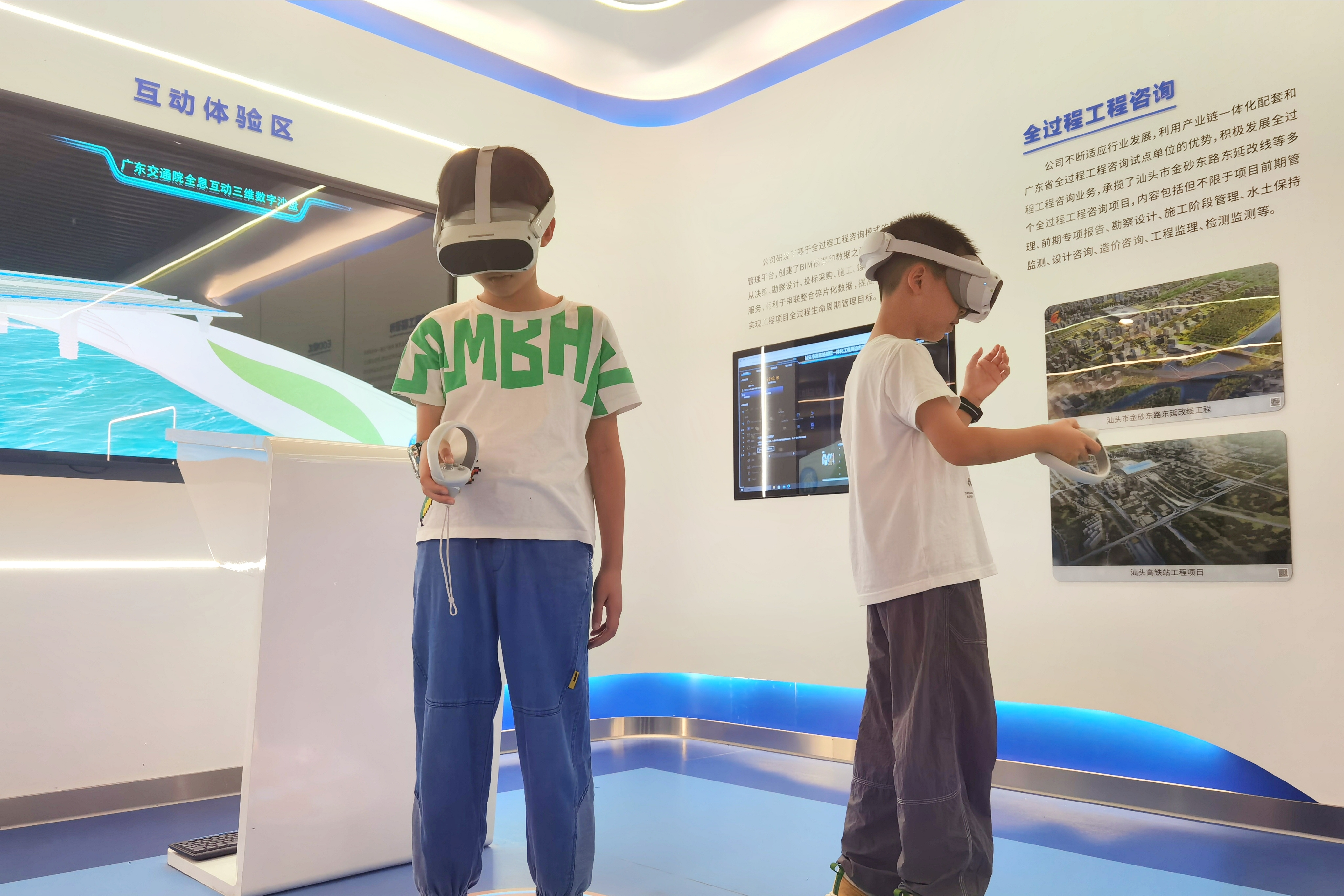 活動(dòng)伊始,家長與孩子率先走進(jìn)公司展廳。在講解員的生動(dòng)講述中,大家系統(tǒng)了解了公司的發(fā)展歷程、核心業(yè)務(wù)領(lǐng)域、前沿技術(shù)探索和企業(yè)文化內(nèi)核。展廳內(nèi)的互動(dòng)屏幕與智能設(shè)備直觀演示了公司自主研發(fā)的交通技術(shù)在生活中的應(yīng)用。孩子們尤其對(duì)VR體驗(yàn)區(qū)充滿好奇,紛紛戴上眼鏡開啟沉浸式之旅,在虛擬世界中“穿梭”于未來交通場(chǎng)景,親手“觸摸”科技賦能生活的無限可能,興奮的歡呼聲此起彼伏。
