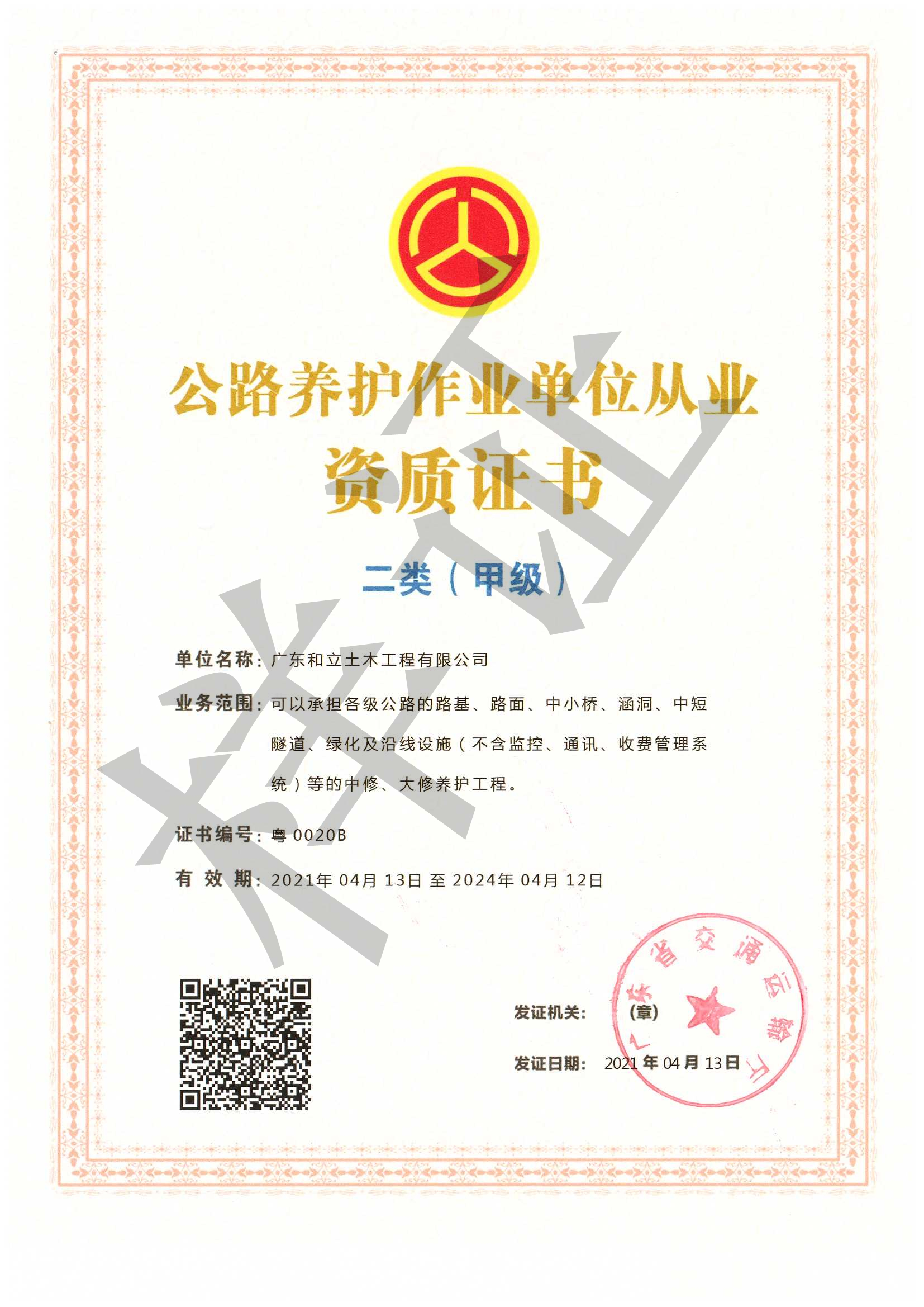 (和立)公路養(yǎng)護(hù)作業(yè)單位從業(yè)資質(zhì)二類(甲級(jí))