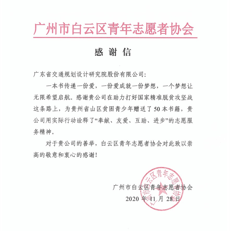 一本書傳遞一份愛,一份愛成就一份夢想,一個夢想讓無限希望啟航。2020年,公司第十二黨支部積極參與廣州市白云區(qū)青年志愿者協(xié)會向貴州省山區(qū)貧困青少年贈書活動,組織支部黨員自發(fā)捐贈少兒讀物,用實際行動踐行公司“至誠至善,求實創(chuàng)新”的核心價值觀,同時也得到了廣州市白云區(qū)青年志愿者協(xié)會的認(rèn)可,并收到協(xié)會的感謝信。
