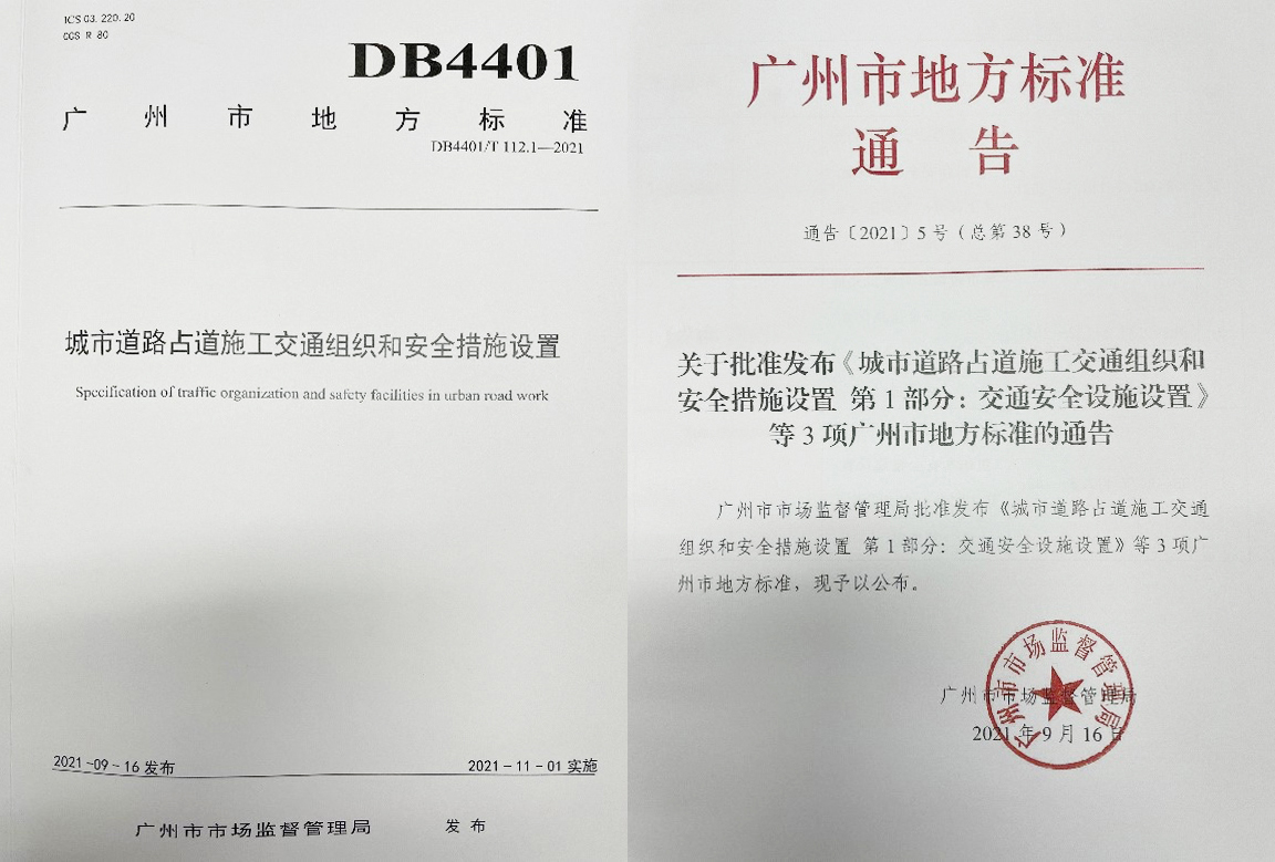 由廣州市交通運輸局牽頭,我公司與市標(biāo)準(zhǔn)化研究院、市公安局交通警察支隊聯(lián)合編制的廣州市地方標(biāo)準(zhǔn)《城市道路占道施工交通組織和安全措施設(shè)置》(DB4401/T 112—2021)于日前獲廣州市市場監(jiān)督管理局批準(zhǔn),并自2021年11月1日起正式實施。