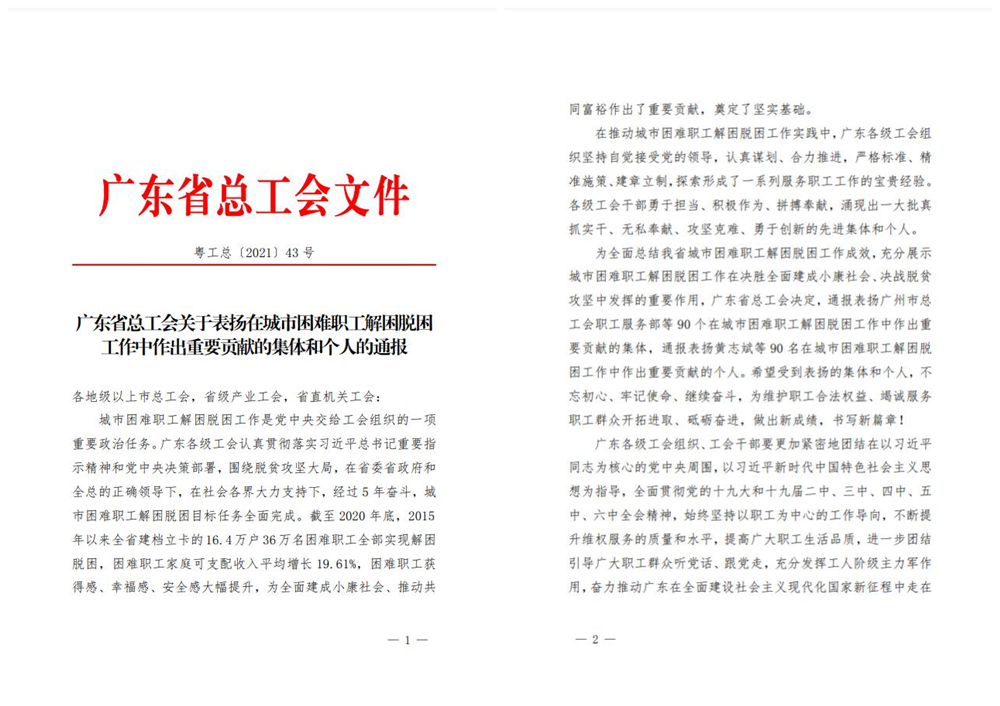 12月20日,廣東省總工會以電視電話會議形式召開了全省城市困難職工解困脫困工作總結(jié)表彰會。會議總結(jié)了五年來全省各級工會推進城市困難職工解困脫困工作取得的重大成就,并表揚了一批在工作中真抓實干、無私奉獻、攻堅克難、勇于創(chuàng)新的先進集體和個人。我公司被省總工會授予“在城市困難職工解困脫困工作中作出重要貢獻集體”榮譽稱號!