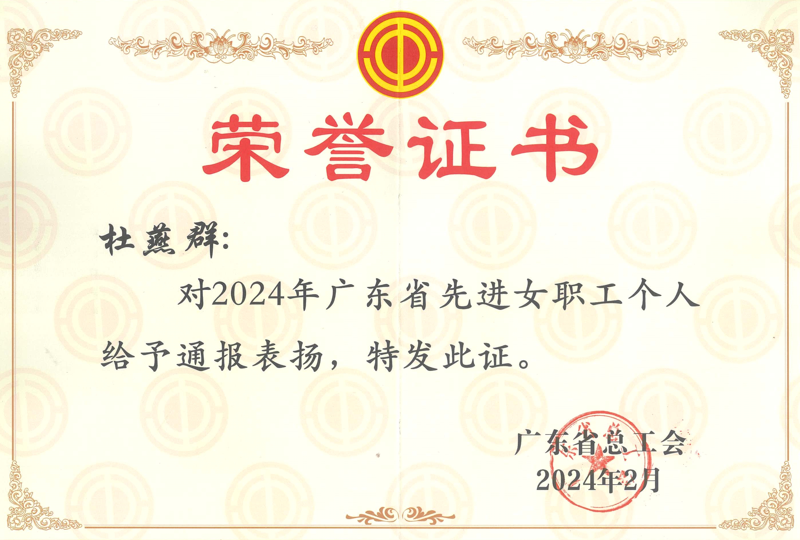 近日,從廣東省總工會傳來喜訊,公司副總工程師杜燕群獲廣東省總工會授予“2024年廣東省先進女職工個人”榮譽稱號,特此報喜。