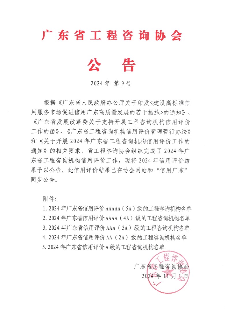 近日,廣東省工程咨詢協(xié)會正式發(fā)布《2024年度廣東省工程咨詢機構信用評價等級結果》(為首次評定),公司獲評為“廣東省信用評價AAAAA(5A)級工程咨詢機構”,5A為評定最高級別。