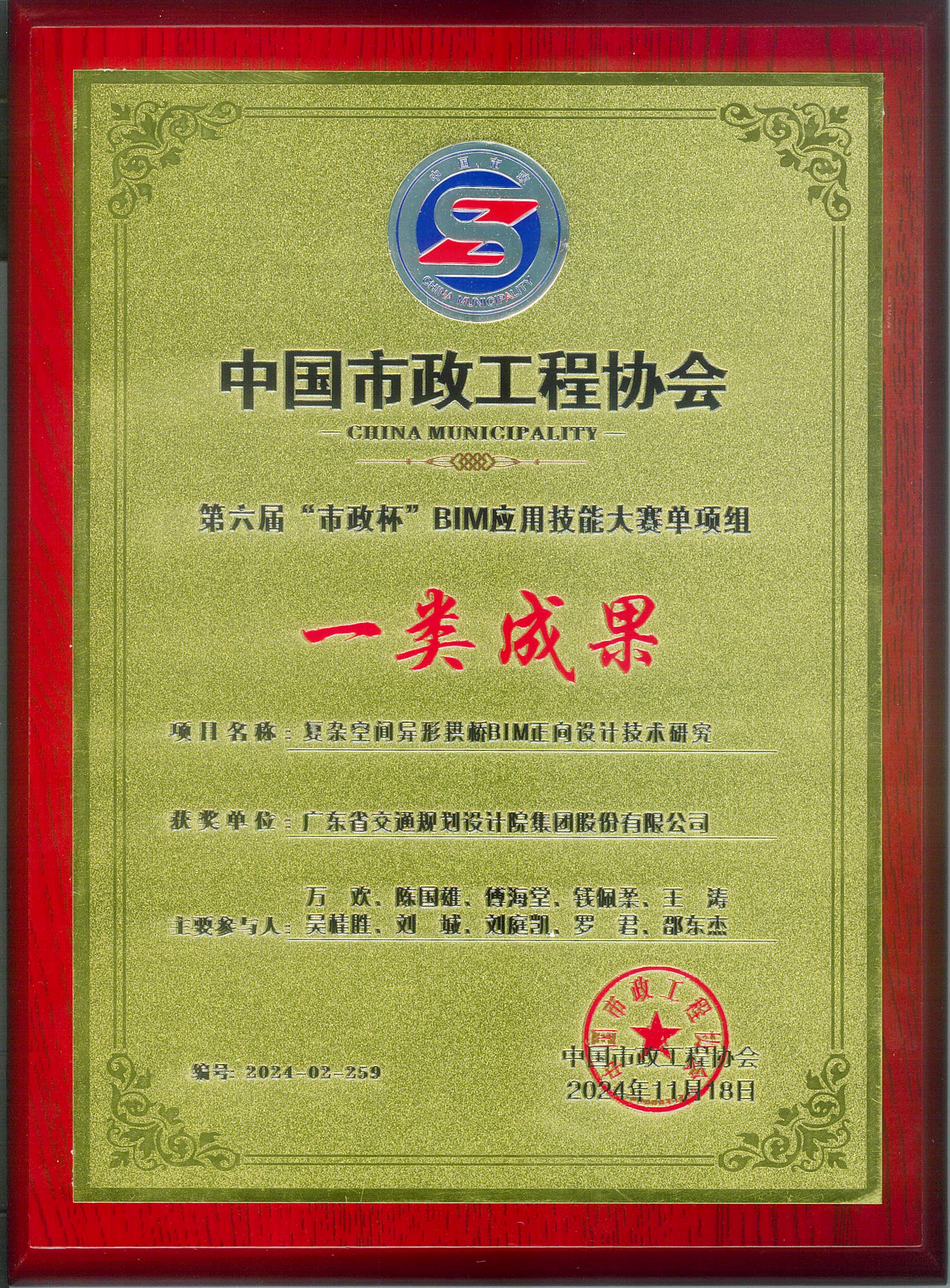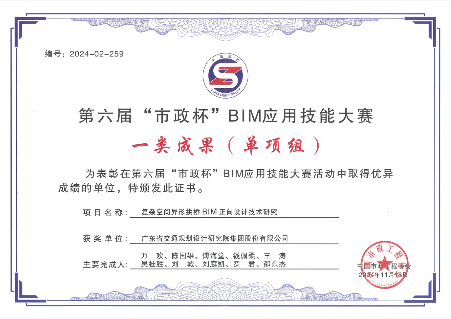 11月21日,中國市政工程協(xié)會第六屆“市政杯”BIM應(yīng)用技能大賽頒獎典禮在濟南市隆重召開。經(jīng)過專家組一審、二審和終審答辯,公司《復(fù)雜空間異形拱橋BIM正向設(shè)計》項目從全國市政行業(yè)686個參評項目的激烈競爭中脫穎而出,榮獲設(shè)計組一類成果。自濱海灣大橋項目、富龍西江特大橋項目連續(xù)兩年獲獎后,公司再次榮獲該獎項一類成果(一等獎)。