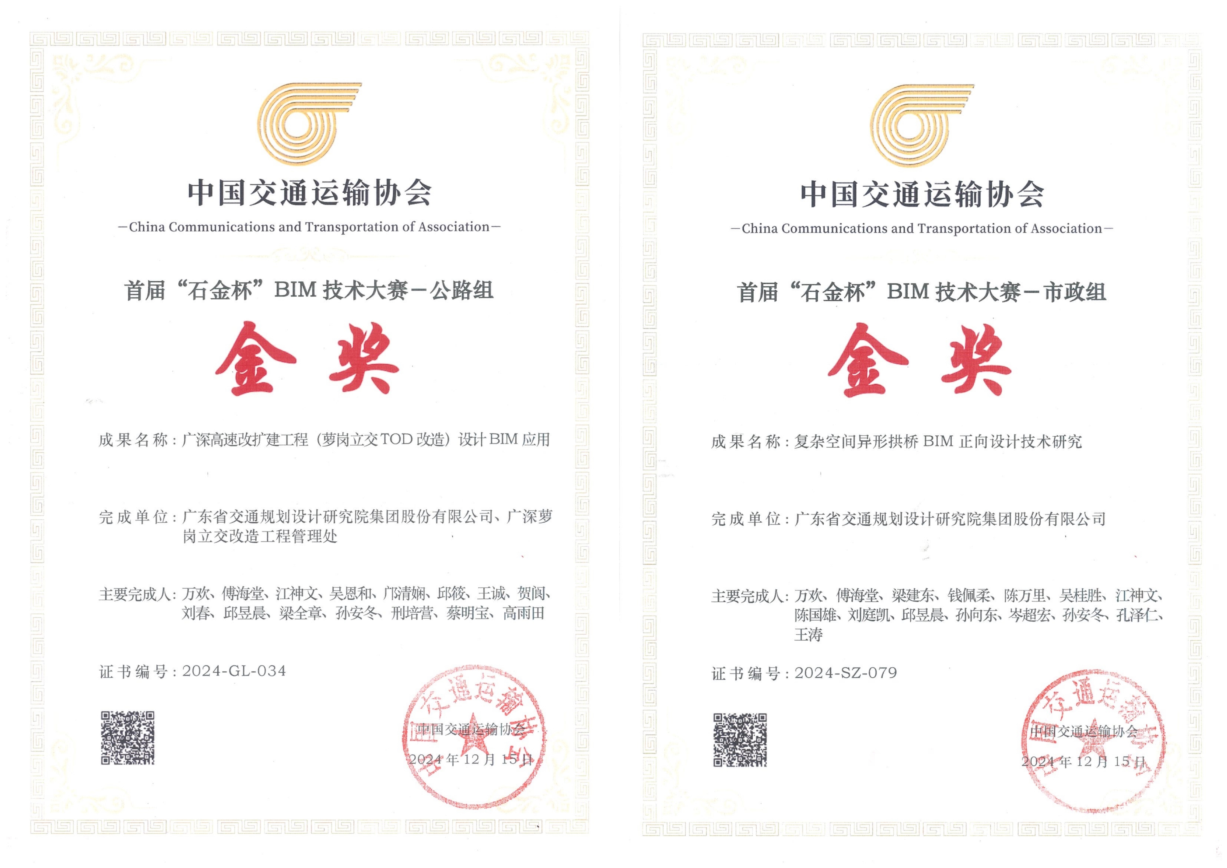 12月15日,中國交通運輸協(xié)會首屆“石金杯”BIM技術大賽頒獎典禮在西安市隆重召開。經過初賽和決賽現(xiàn)場答辯,公司《廣深高速改擴建工程(蘿崗立交TOD改造)設計BIM應用》和《復雜空間異形拱橋BIM正向設計》在500多個項目中脫穎而出,分別榮獲公路組金獎和市政組金獎。