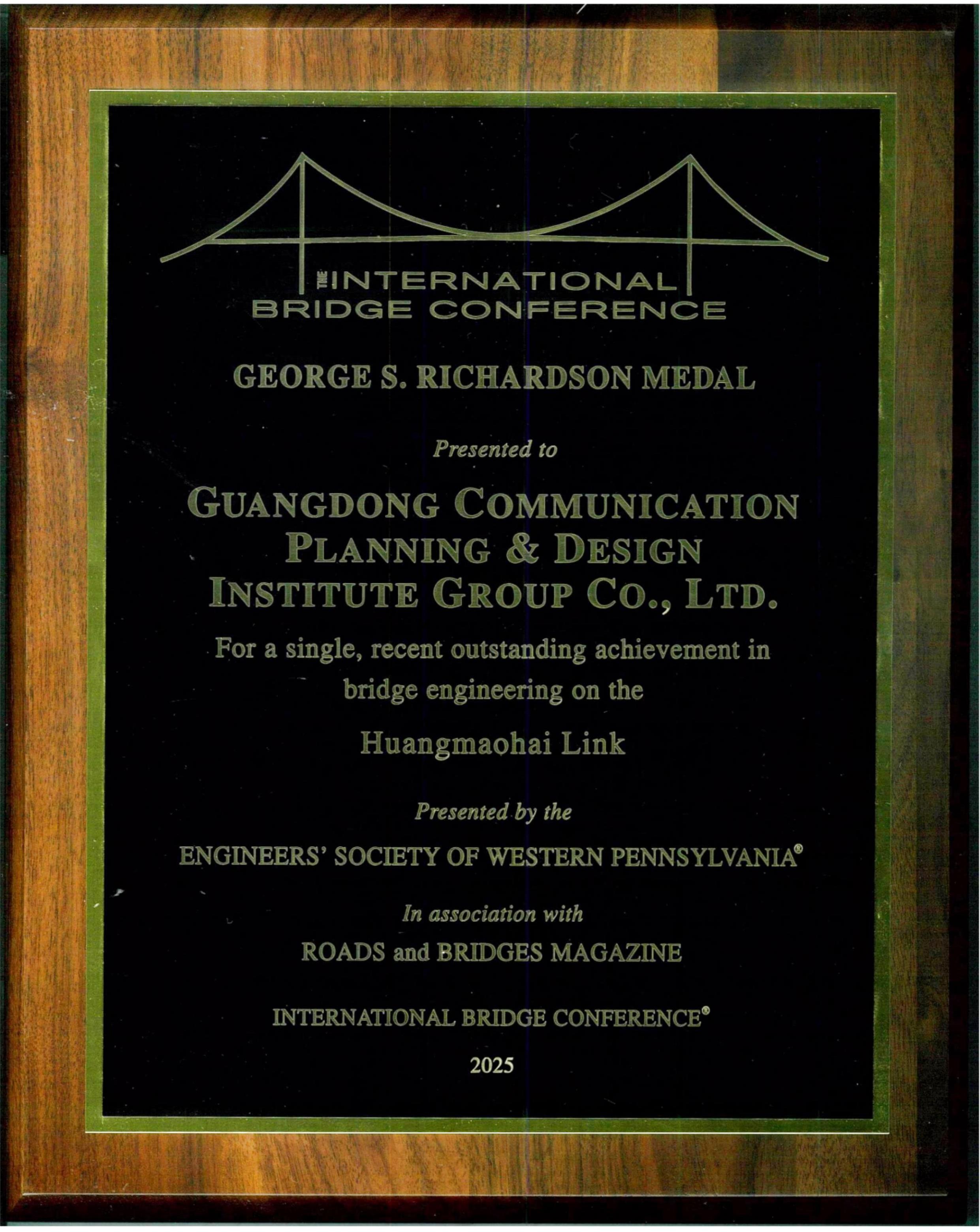 近日,公司承擔(dān)的黃茅??绾Mǖ理?xiàng)目榮獲2025年喬治?理查德森獎(jiǎng)(GeorgeS.Richardson Medal),成為本屆我國唯一獲此殊榮的項(xiàng)目。作為獲獎(jiǎng)單位,公司受邀參加了2025年7月14日-16日(美國當(dāng)?shù)貢r(shí)間)在賓夕法尼亞匹茲堡舉行的第42屆國際橋梁大會(huì)(International Bridge Conference,簡(jiǎn)稱IBC),公司第四設(shè)計(jì)院總工程師徐德志作為公司代表參加了大會(huì)并領(lǐng)取了獎(jiǎng)項(xiàng)。