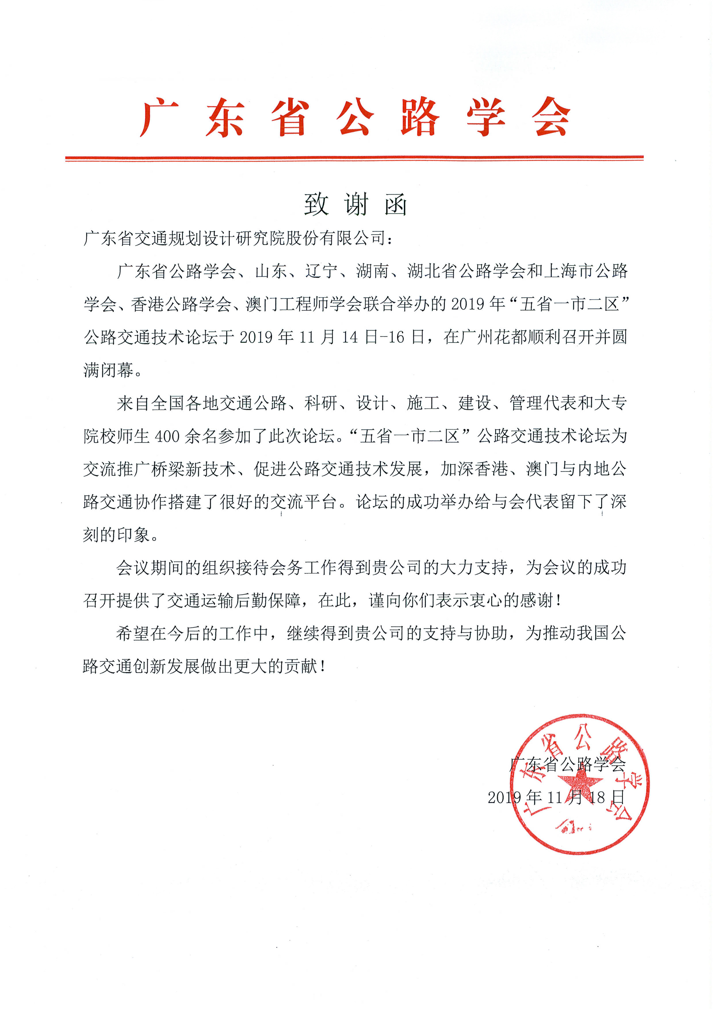 我公司高度重視此次論壇的協(xié)辦工作,派出會務(wù)團隊全程跟進、積極配合、傾力服務(wù),為會議的成功召開貢獻了一份力量,得到了主辦方廣東省公路學(xué)會的高度肯定。為此,省公路學(xué)會特發(fā)來致謝函向我公司表示感謝!
