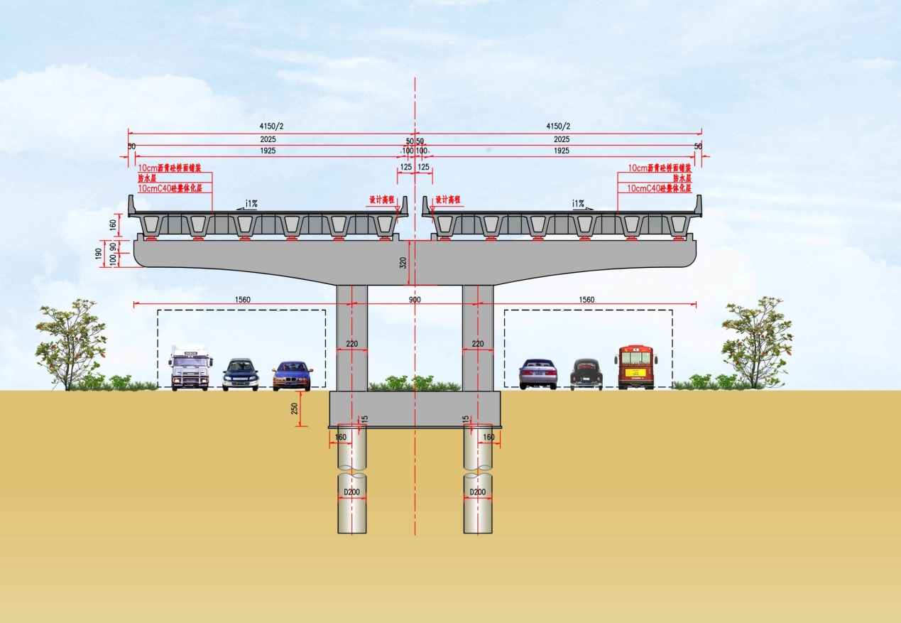 本項目中,橋梁與民古路共線長度達27.25km。民古路利用高速公路橋下空間布設,因而在設計時注重對橋梁的上、下部結構的選用以及橋梁景觀等內容的比選。推薦方案橋梁墩柱利用橋下道路中央分隔帶集中落墩,采用了整幅大懸臂雙柱墩,并以倒“T”截面降低蓋梁視覺高度,減少占用橋下空間。