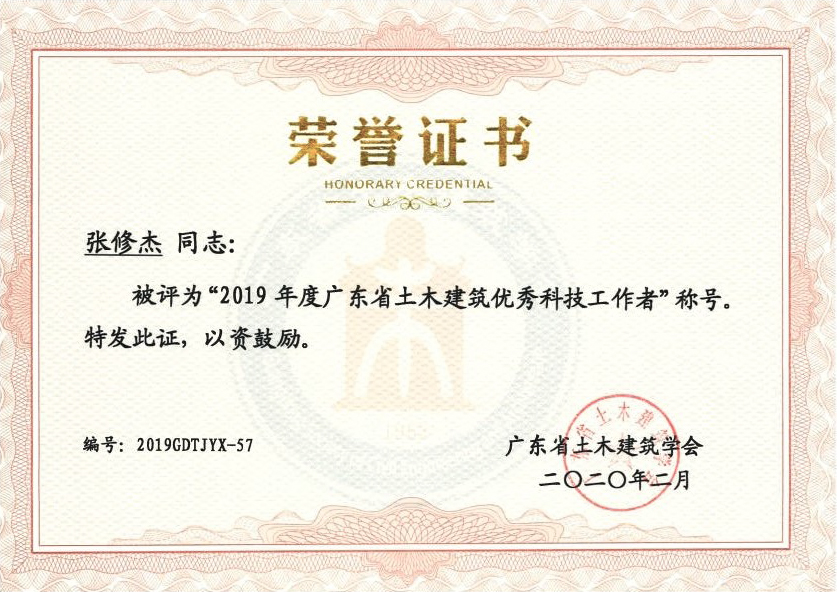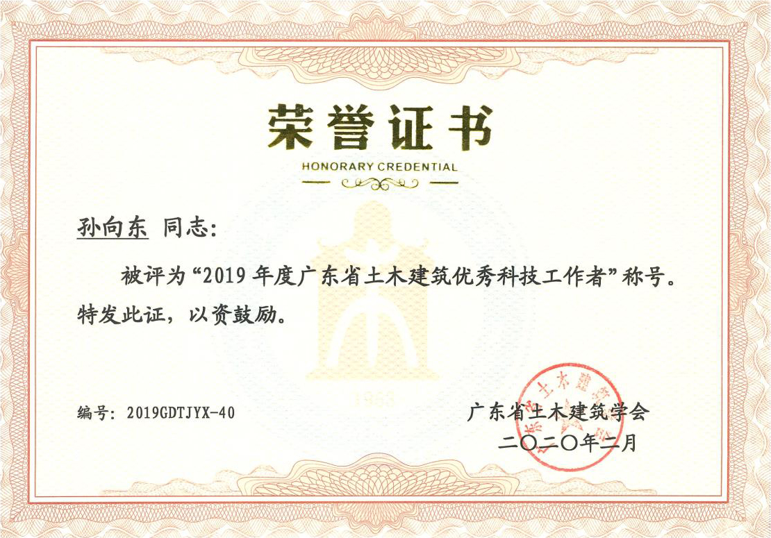 近日,我公司副總工程師孫向東、張修杰同志榮獲“2019年度廣東省土木建筑優(yōu)秀科技工作者”榮譽稱號。這是繼梁立農(nóng)總工程師、彭向榮首席副總工程師之后,我公司再次獲得該榮譽稱號的兩位技術專家。