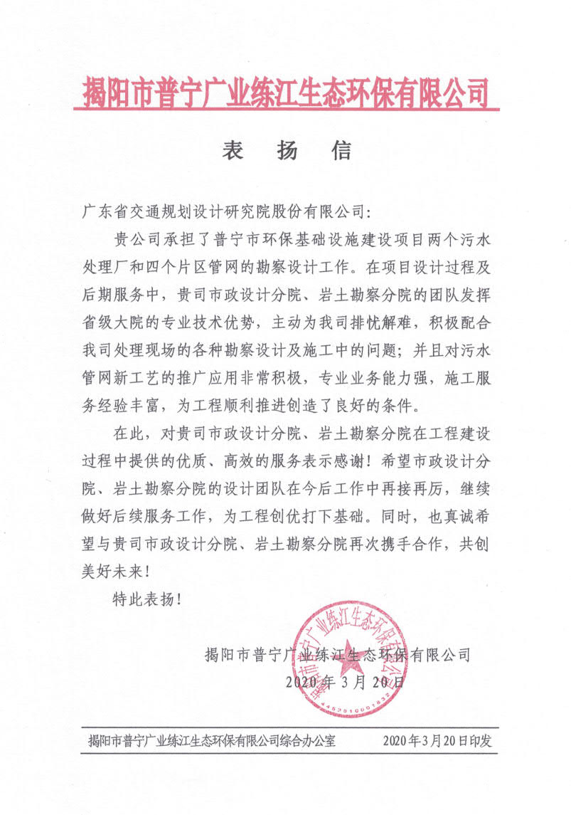 近日,揭陽市普寧廣業(yè)練江生態(tài)環(huán)保有限公司發(fā)來表揚(yáng)信,對(duì)我公司在普寧市練江環(huán)?;A(chǔ)設(shè)施建設(shè)項(xiàng)目勘察設(shè)計(jì)和施工后服務(wù)工作中,體現(xiàn)的專業(yè)技術(shù)優(yōu)勢(shì)、專業(yè)服務(wù)能力、豐富的施工服務(wù)經(jīng)驗(yàn)以及積極推廣應(yīng)用新工藝的實(shí)際行動(dòng)表示充分肯定,并對(duì)我公司具體負(fù)責(zé)該項(xiàng)目的市政設(shè)計(jì)分院和巖土勘察分院團(tuán)隊(duì)給予了通報(bào)表揚(yáng)。